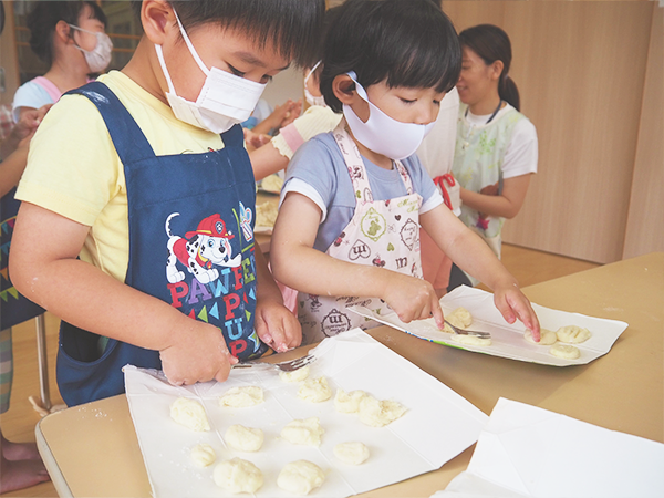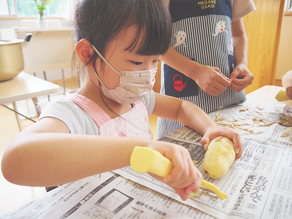 - 月に1回、エプロンとマスクを付け、お昼ご飯やおやつを作ります。(さくら組)