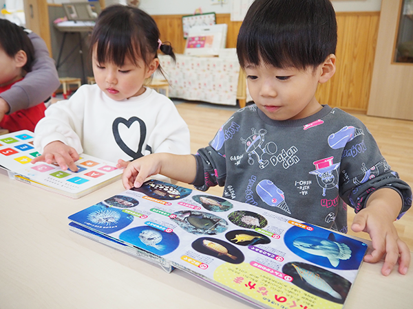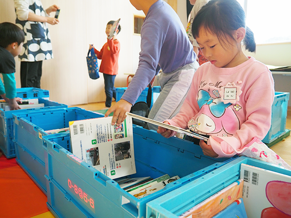 - 月に1回、移動図書館があります。たくさんの絵本から好きな本を3冊選び、翌月まで本を借りることができます。